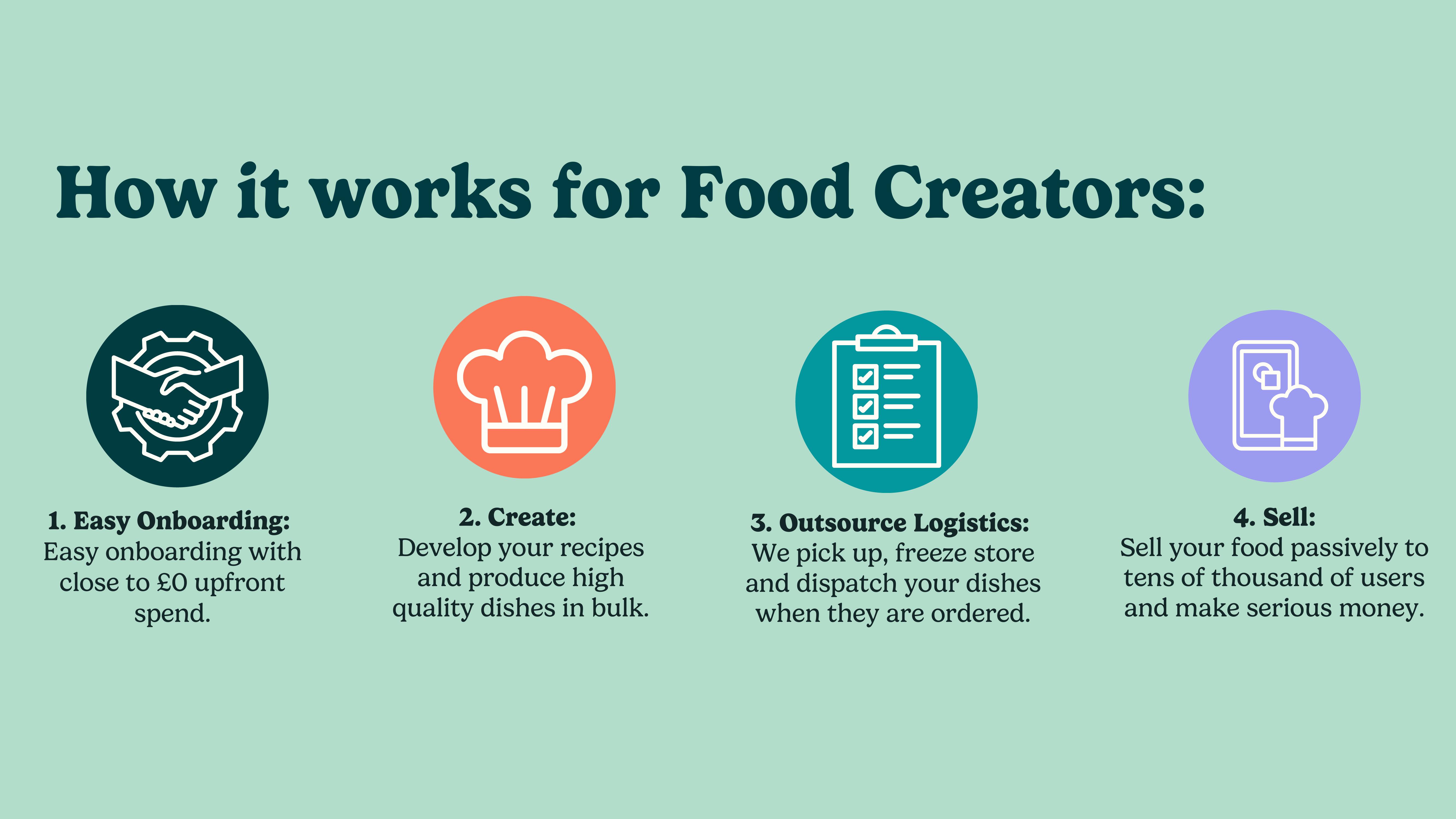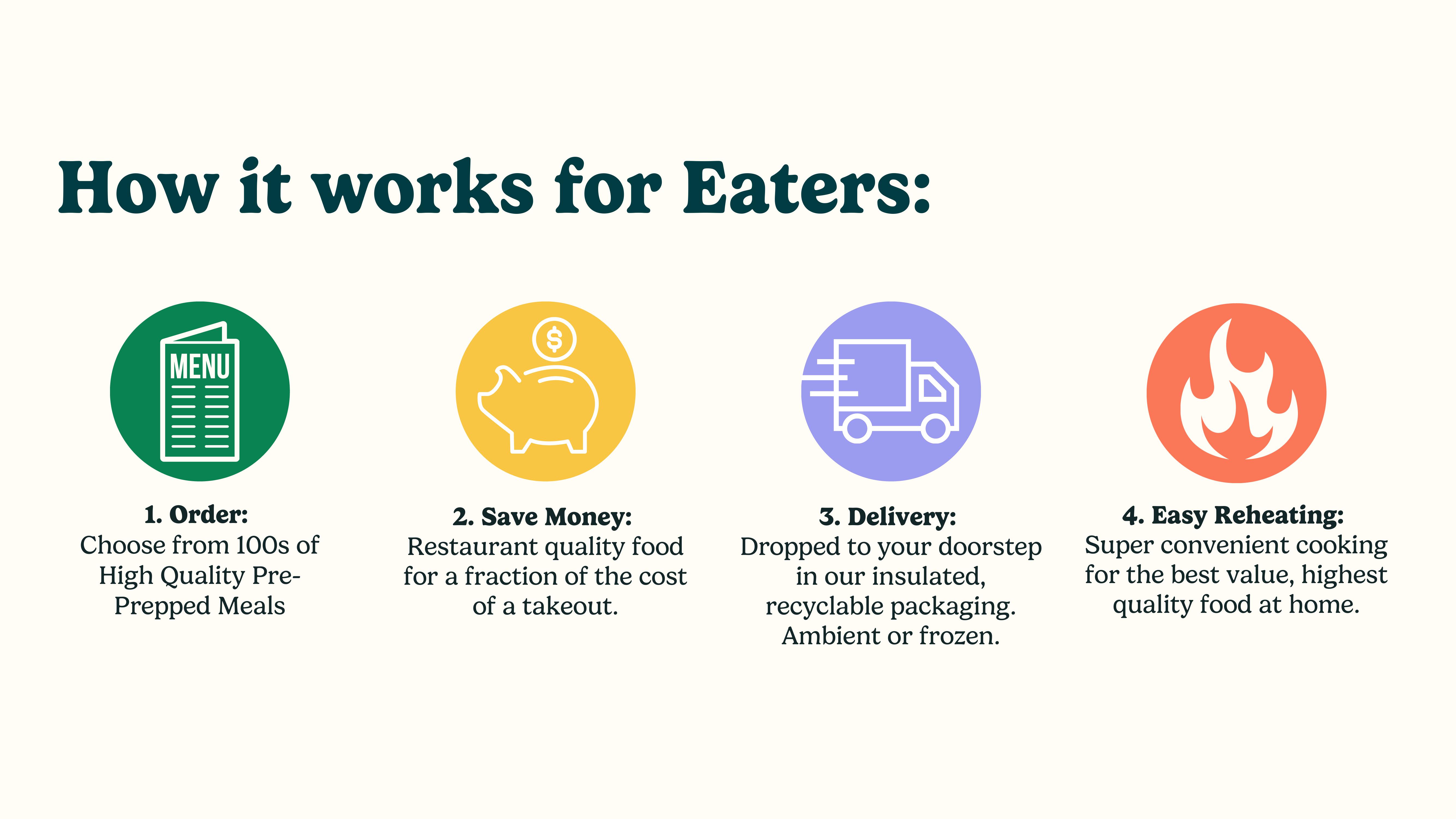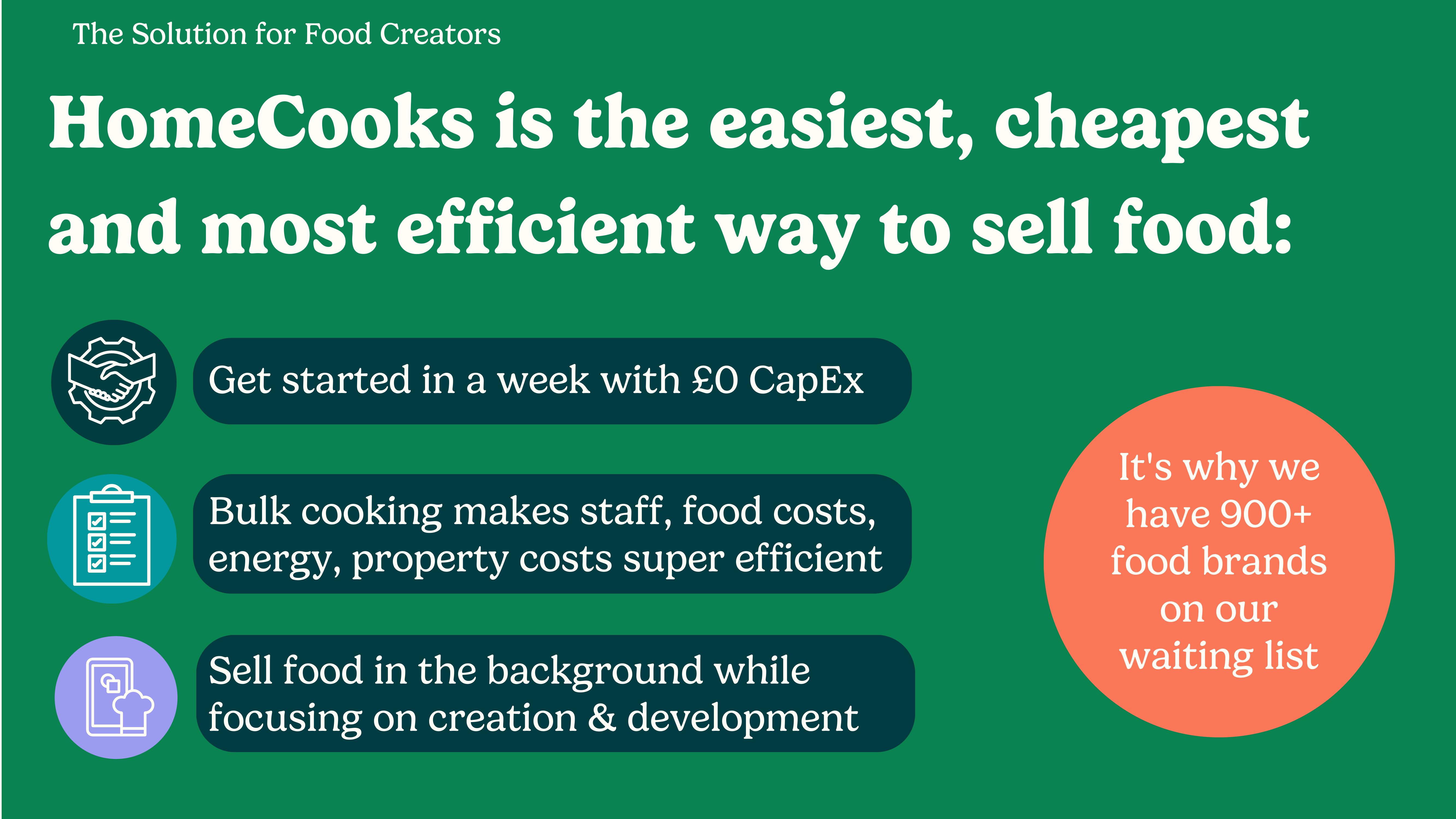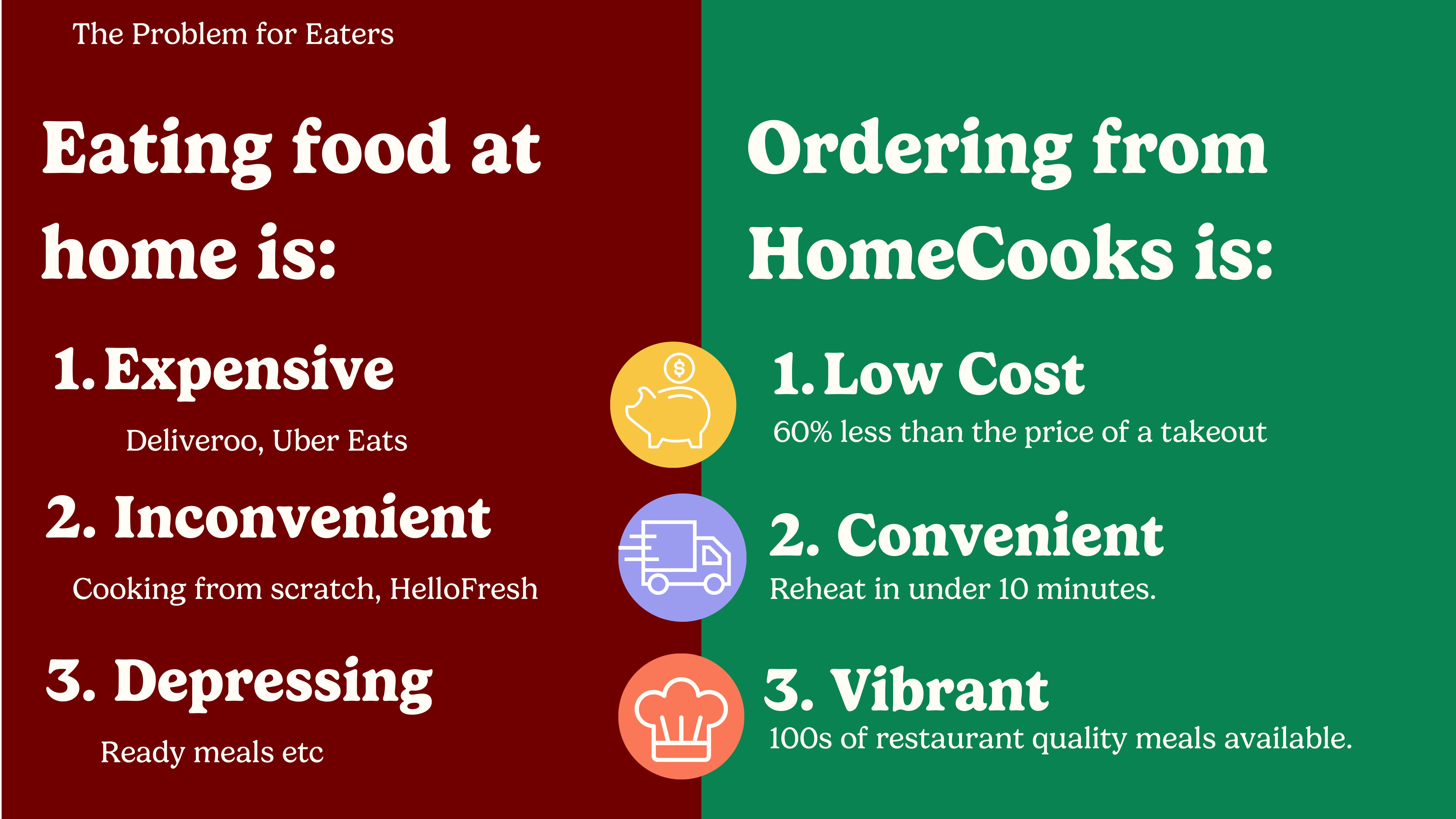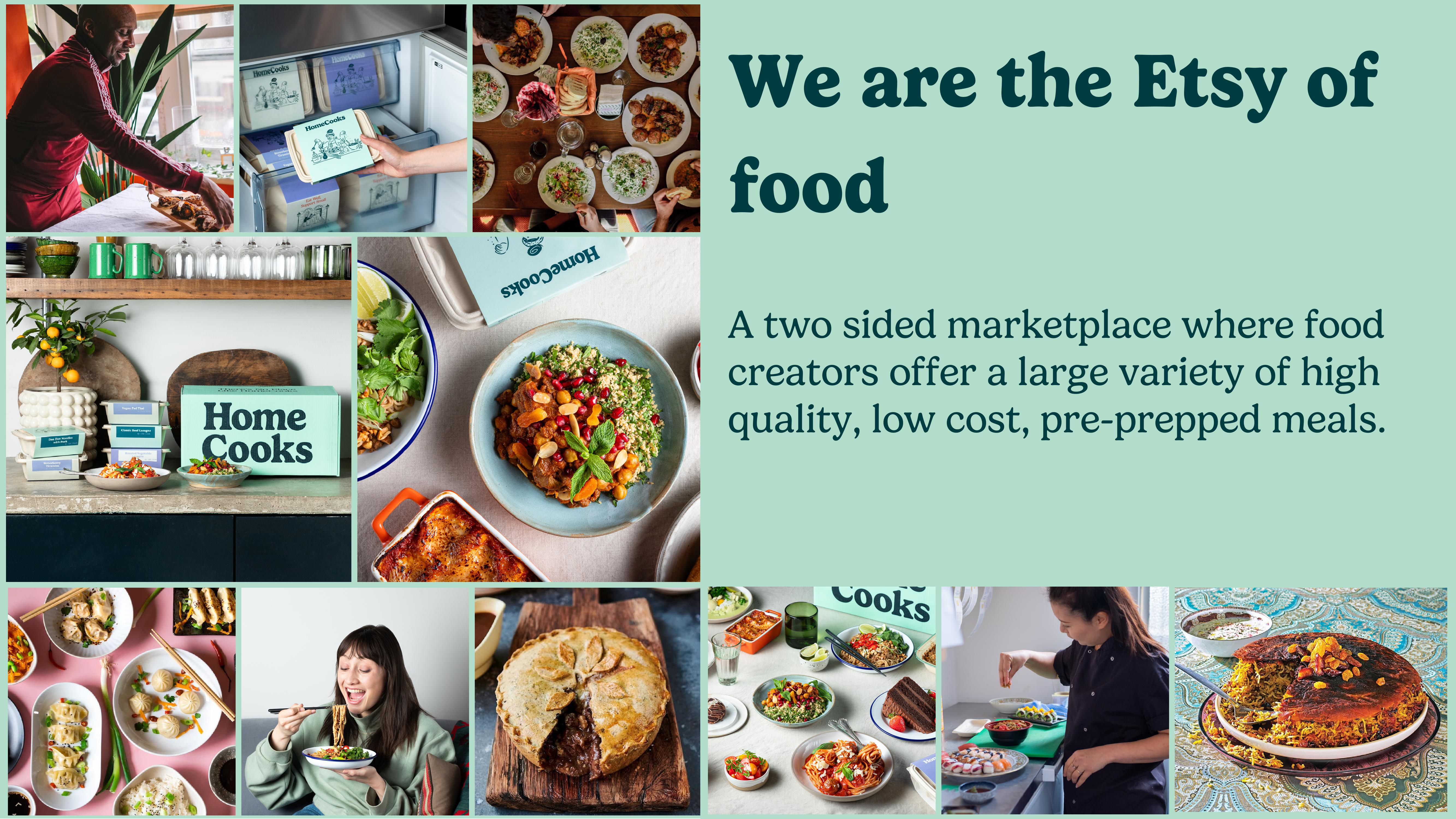 This deck presents HomeCooks, a two-sided food marketplace described as the “Etsy of food,” where independent chefs and food creators sell high-quality, pre-prepped meals directly to consumers. It highlights the problems with expensive takeout, inconvenient meal kits, and low-quality ready meals, positioning HomeCooks as a cheaper, more convenient, and more diverse alternative. The presentation showcases rapid traction in the UK with thousands of meals sold, strong revenue growth, and a 900+ chef waiting list, while outlining a massive £18bn+ market opportunity, clear network effects, social impact benefits, and a roadmap toward national expansion, European launch, and global scale.