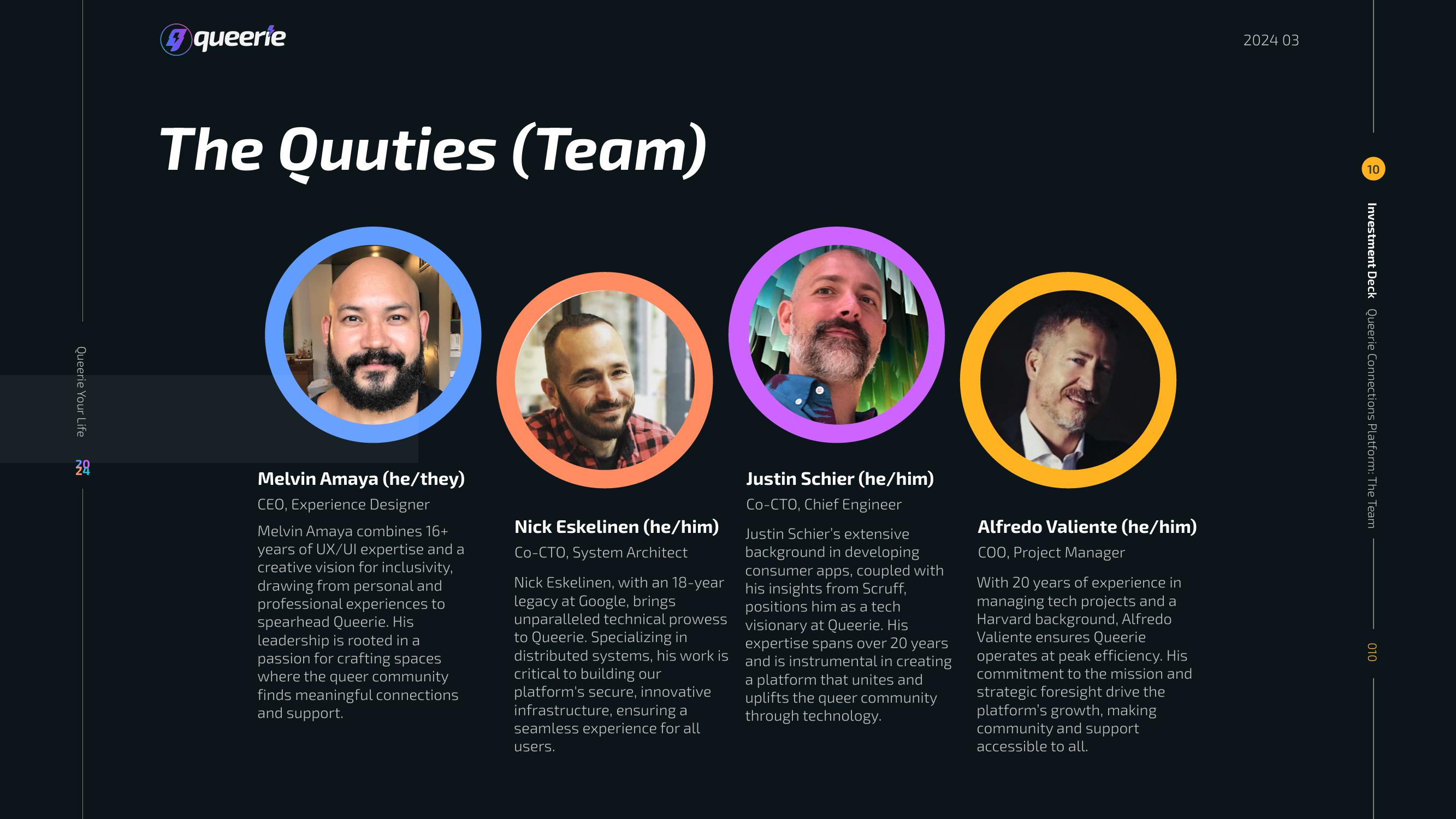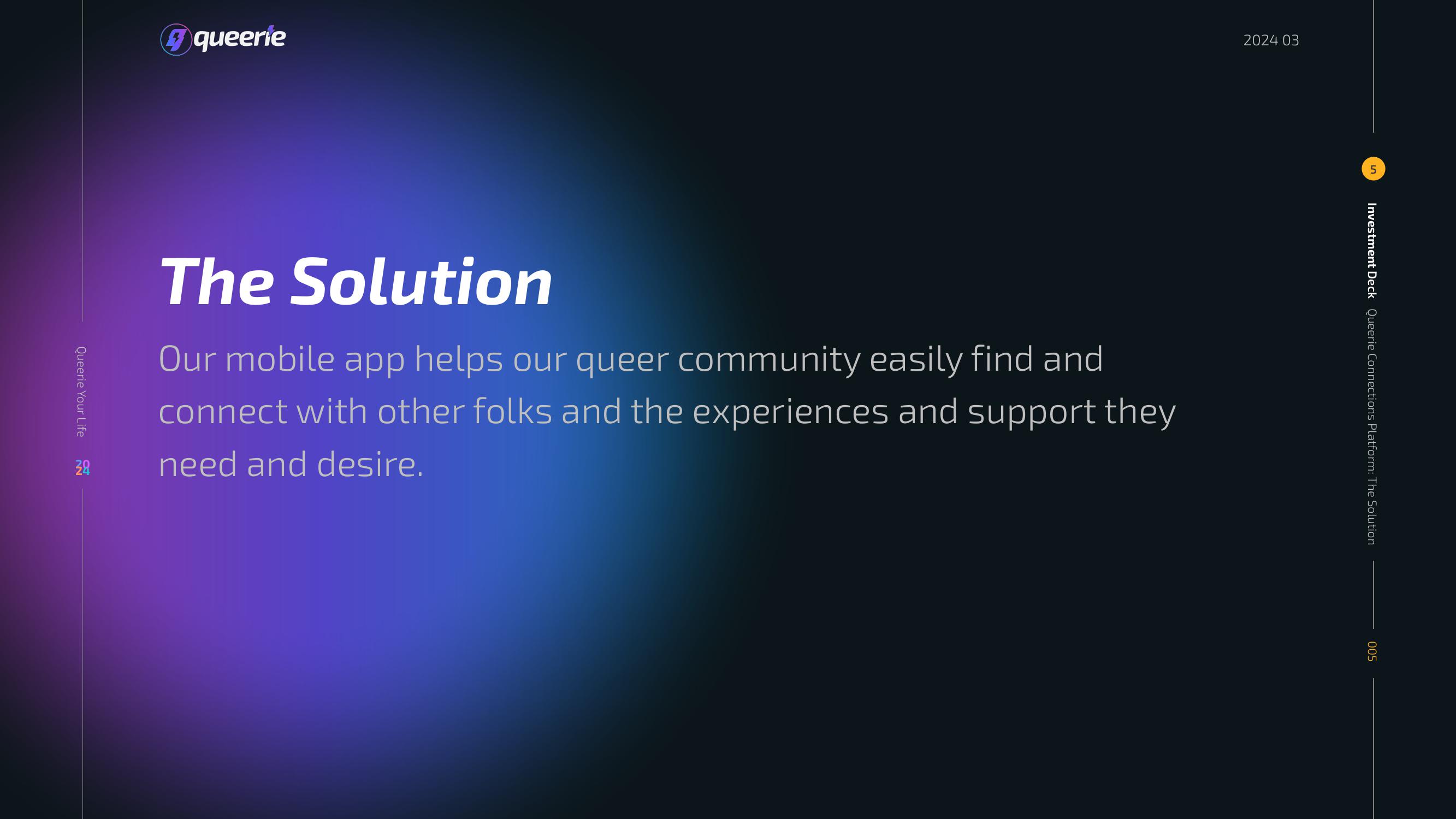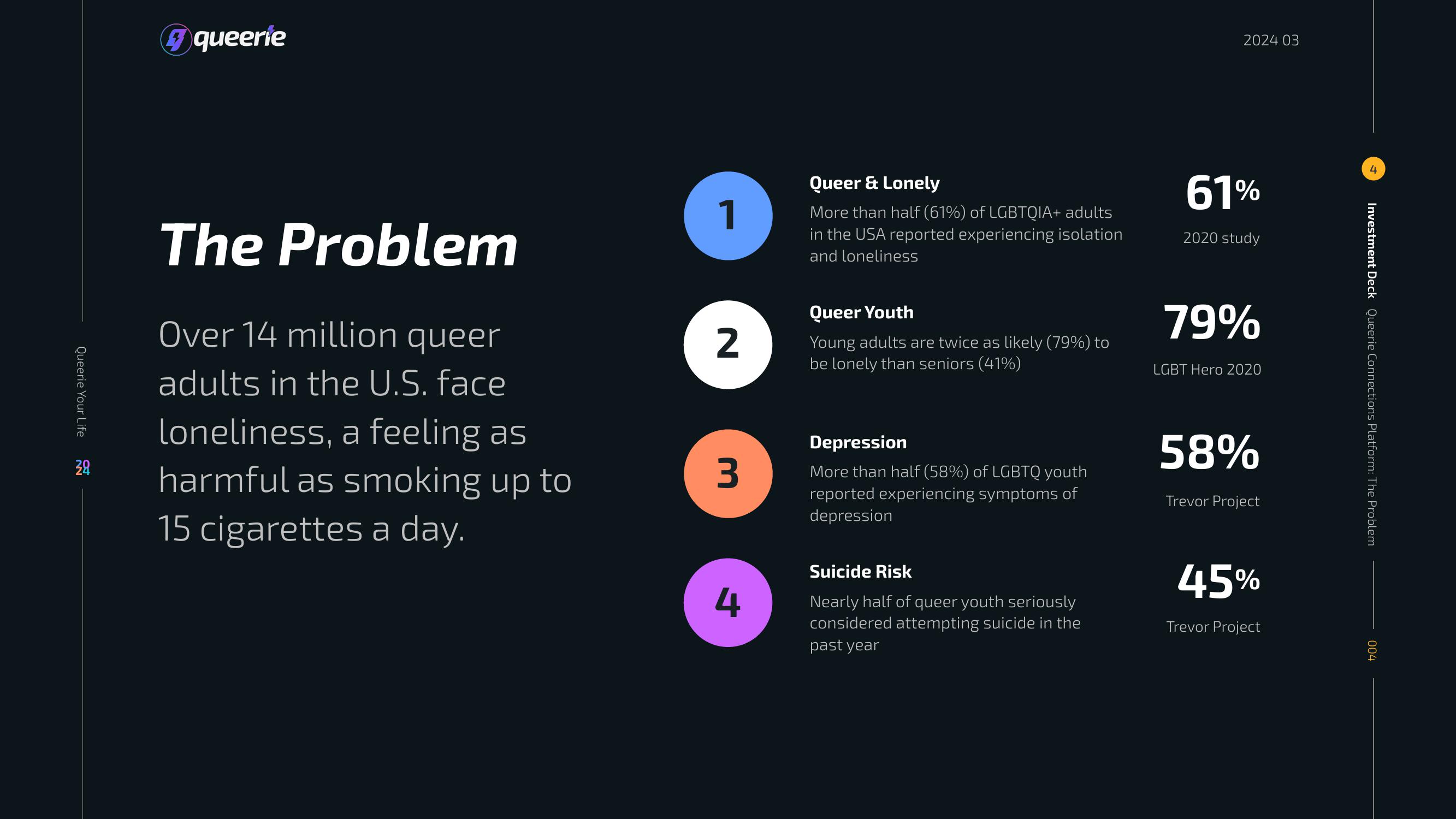 This deck introduces Queerie, a connections platform built to combat loneliness and isolation in the LGBTQIA+ community by helping queer individuals find meaningful relationships, events, and support networks. It outlines the scale of the problem, particularly among queer youth, and presents Queerie’s mobile app as a cost-effective, inclusive, and community-focused alternative to mainstream dating platforms. The deck highlights market size, early traction with beta testers, customer demand surveys, and a team with deep technical and design expertise, while detailing a $300k pre-seed raise to complete the app, grow to 3,000 premium subscribers, and expand into additional U.S. cities.