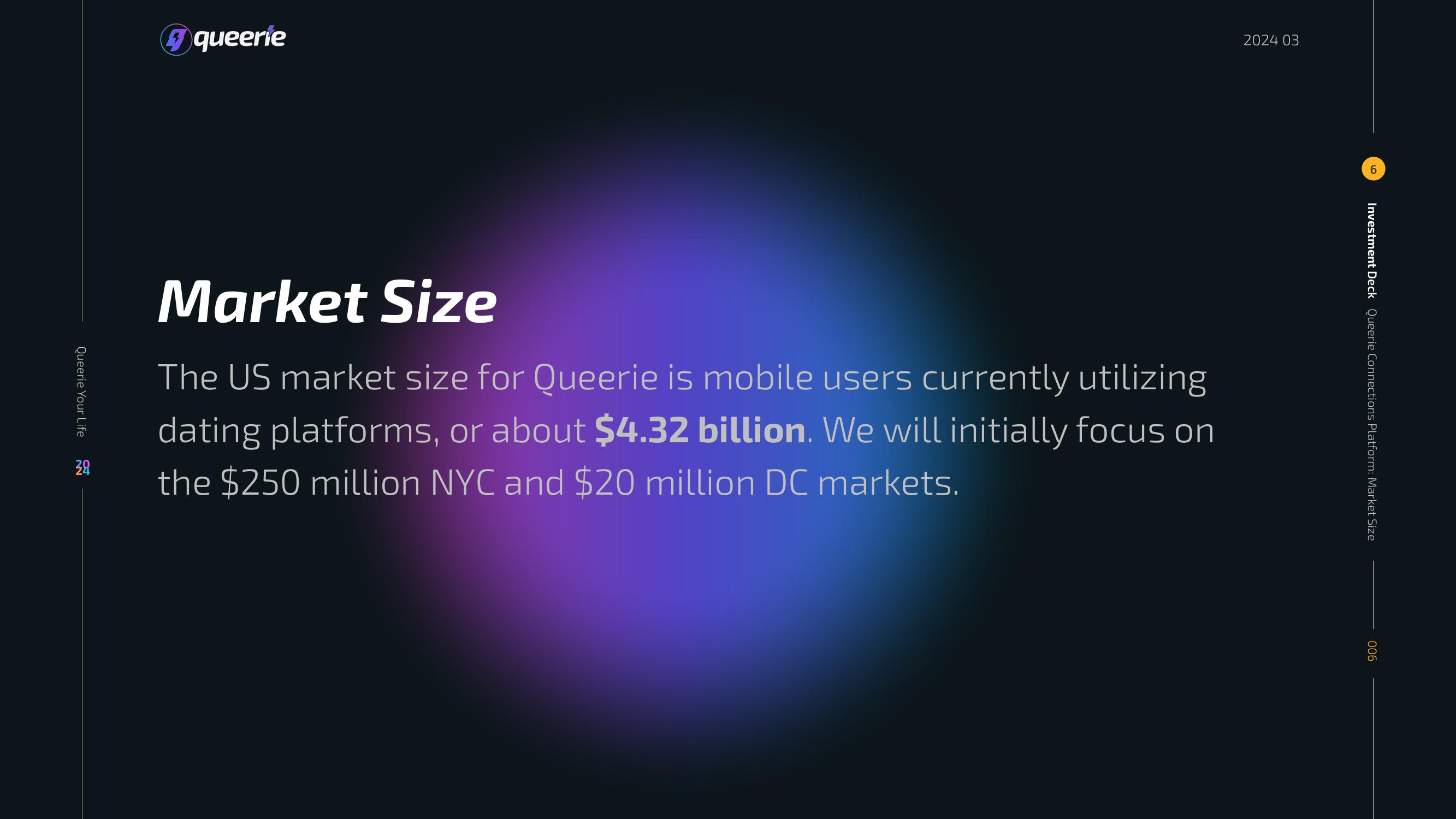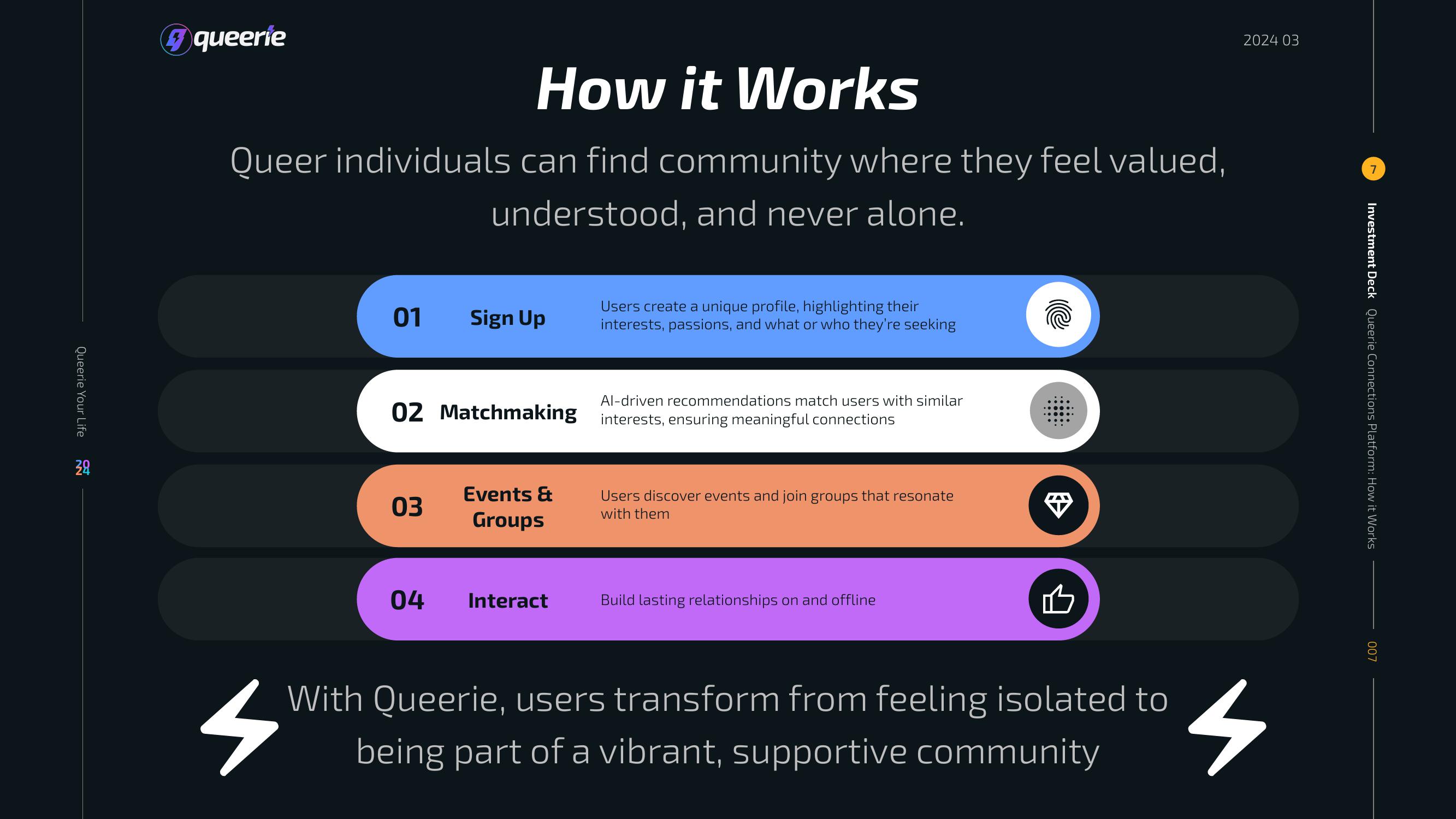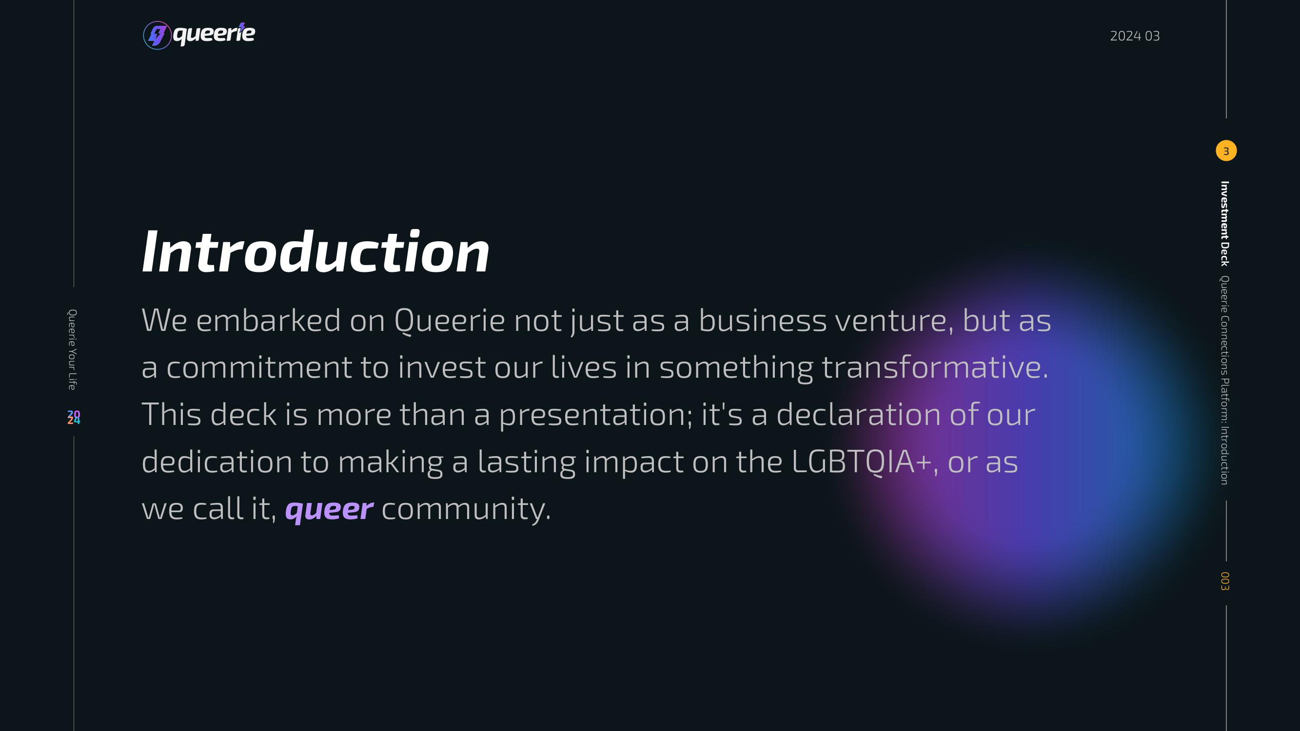 This deck introduces Queerie, a connections platform built to combat loneliness and isolation in the LGBTQIA+ community by helping queer individuals find meaningful relationships, events, and support networks. It outlines the scale of the problem, particularly among queer youth, and presents Queerie’s mobile app as a cost-effective, inclusive, and community-focused alternative to mainstream dating platforms. The deck highlights market size, early traction with beta testers, customer demand surveys, and a team with deep technical and design expertise, while detailing a $300k pre-seed raise to complete the app, grow to 3,000 premium subscribers, and expand into additional U.S. cities.