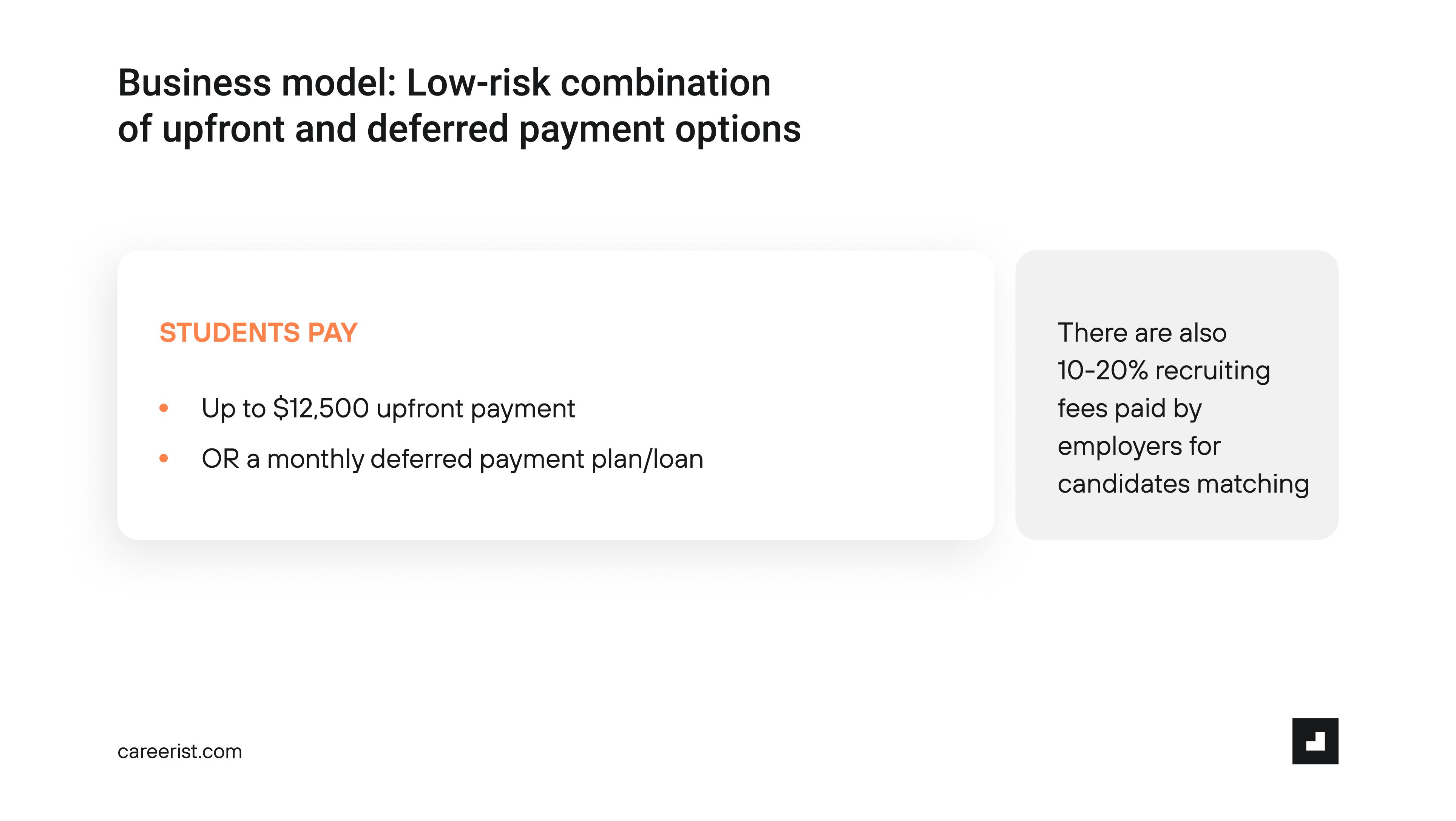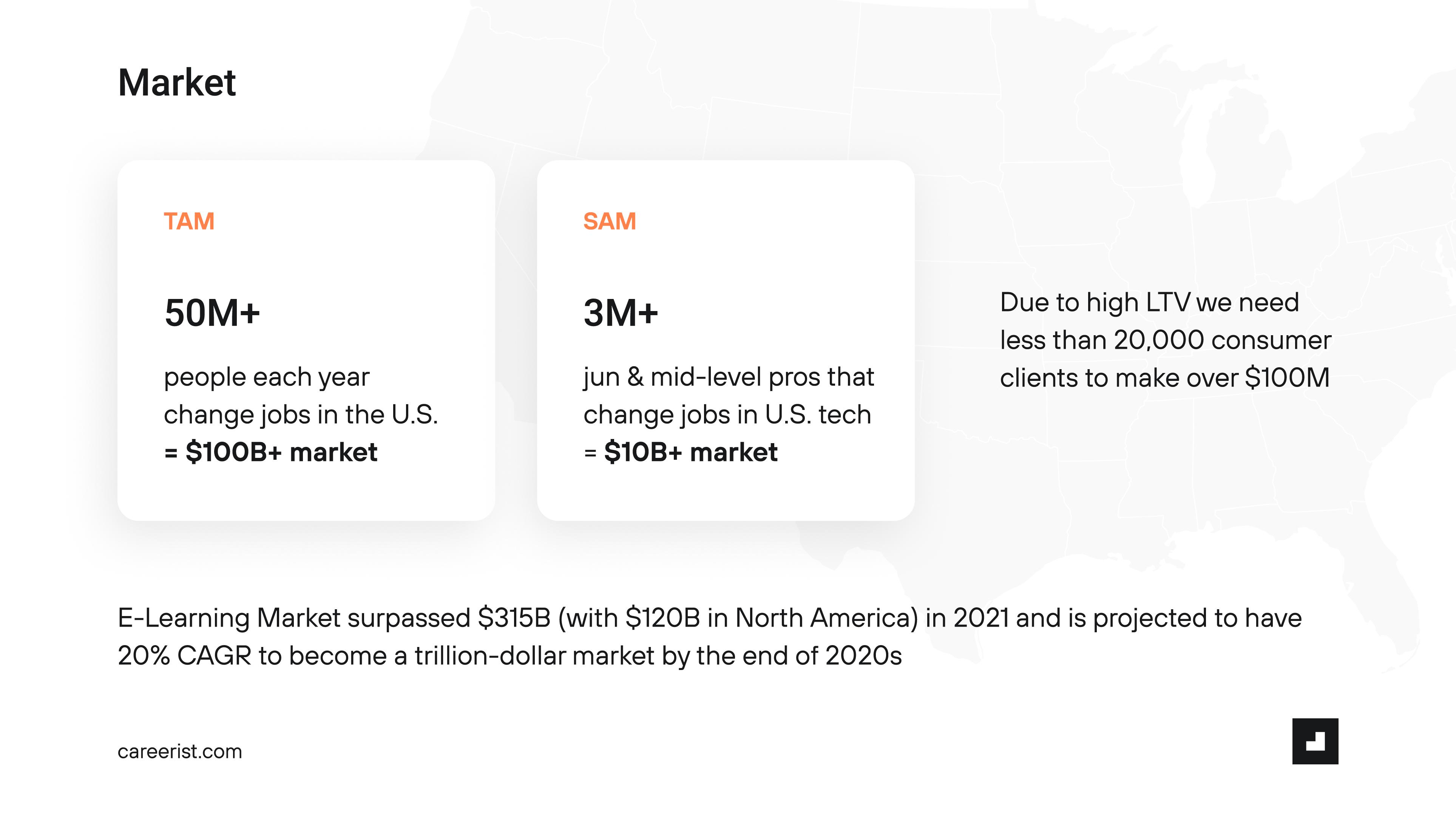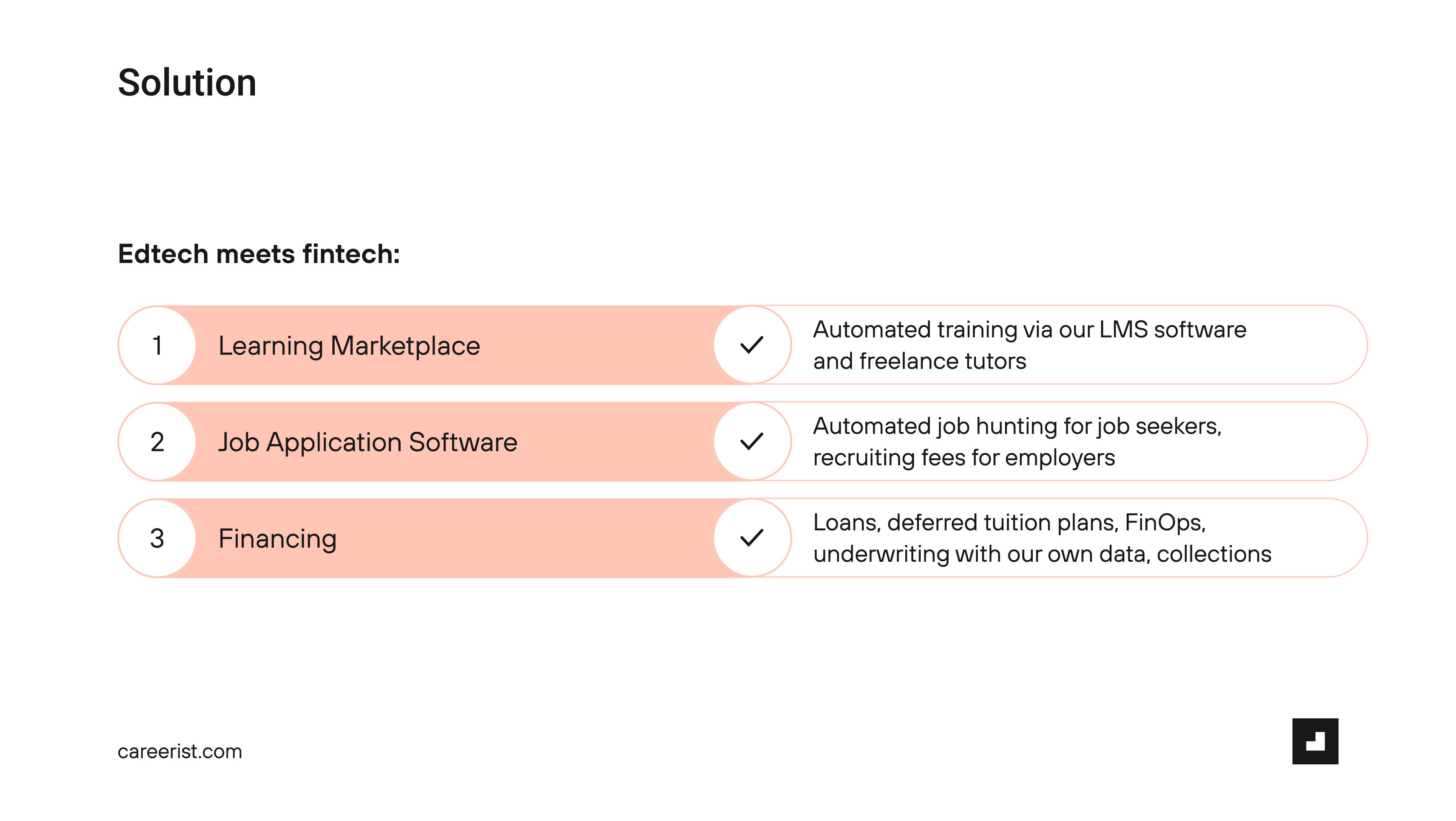 This pitch deck presents Careerist, an ed-fintech platform that finances, trains, and places job seekers into roles within the U.S. tech industry and beyond. It outlines the challenges faced by junior and mid-level professionals—such as lack of job-specific skills, high rejection rates, and limited financial resources—and demonstrates how Careerist bridges this gap with a unique combination of learning marketplace, job application software, and financing solutions.