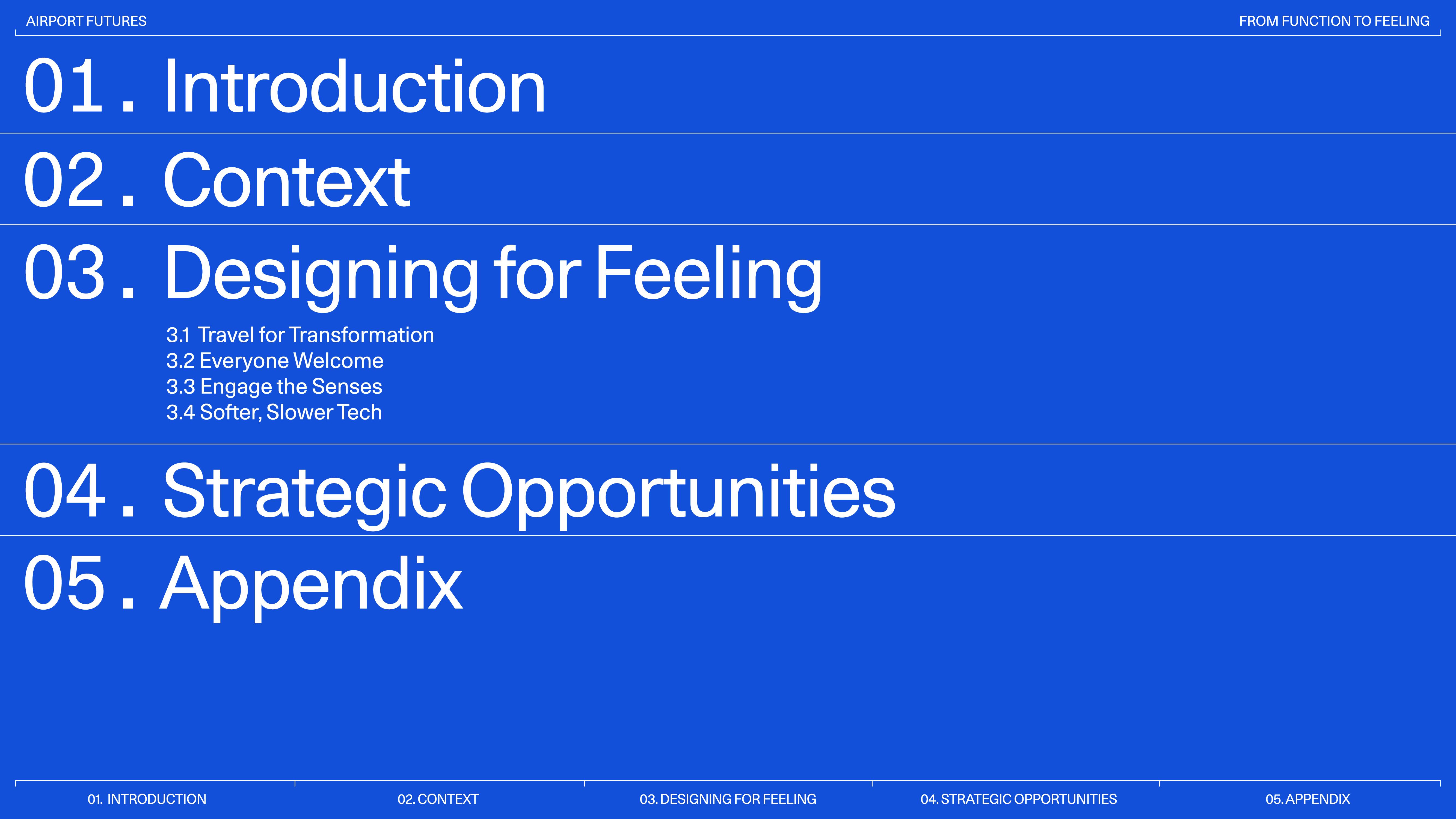 The Airport Futures: From Function to Feeling report by GHARAGE reimagines airports as more than transit hubs, exploring how design can reduce stress and create spaces of care, community, and sensory delight. Drawing on global surveys and expert interviews, it outlines opportunities to enhance traveller wellbeing through biophilic design, multi-sensory experiences, inclusive spaces, and softer, human-centred tech. Visually, the report mirrors its theme—using clean layouts, bold typography, and immersive photography to balance strategic foresight with emotional storytelling. The design feels modern and editorial, making the document itself an example of how function and feeling can co-exist.