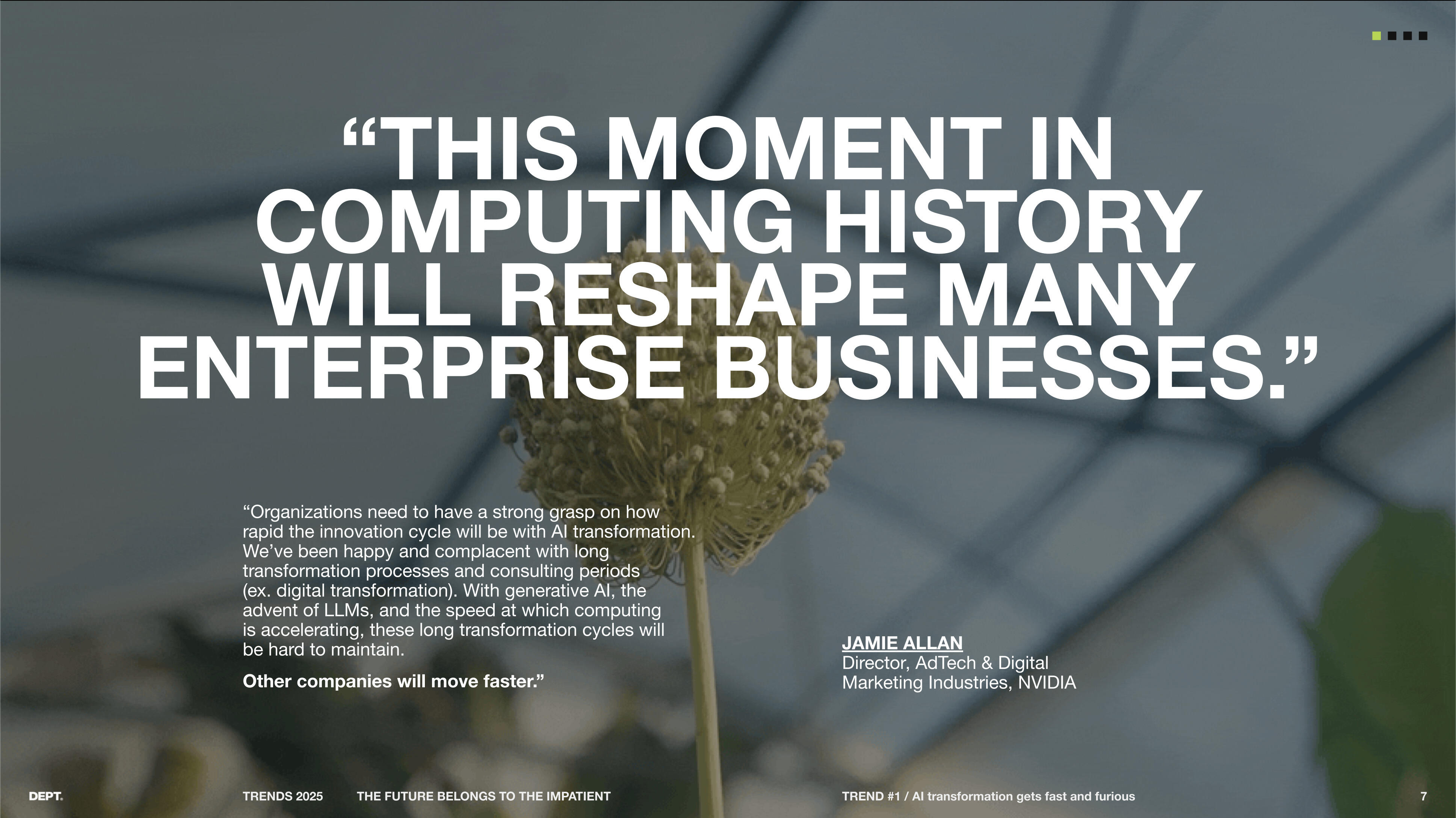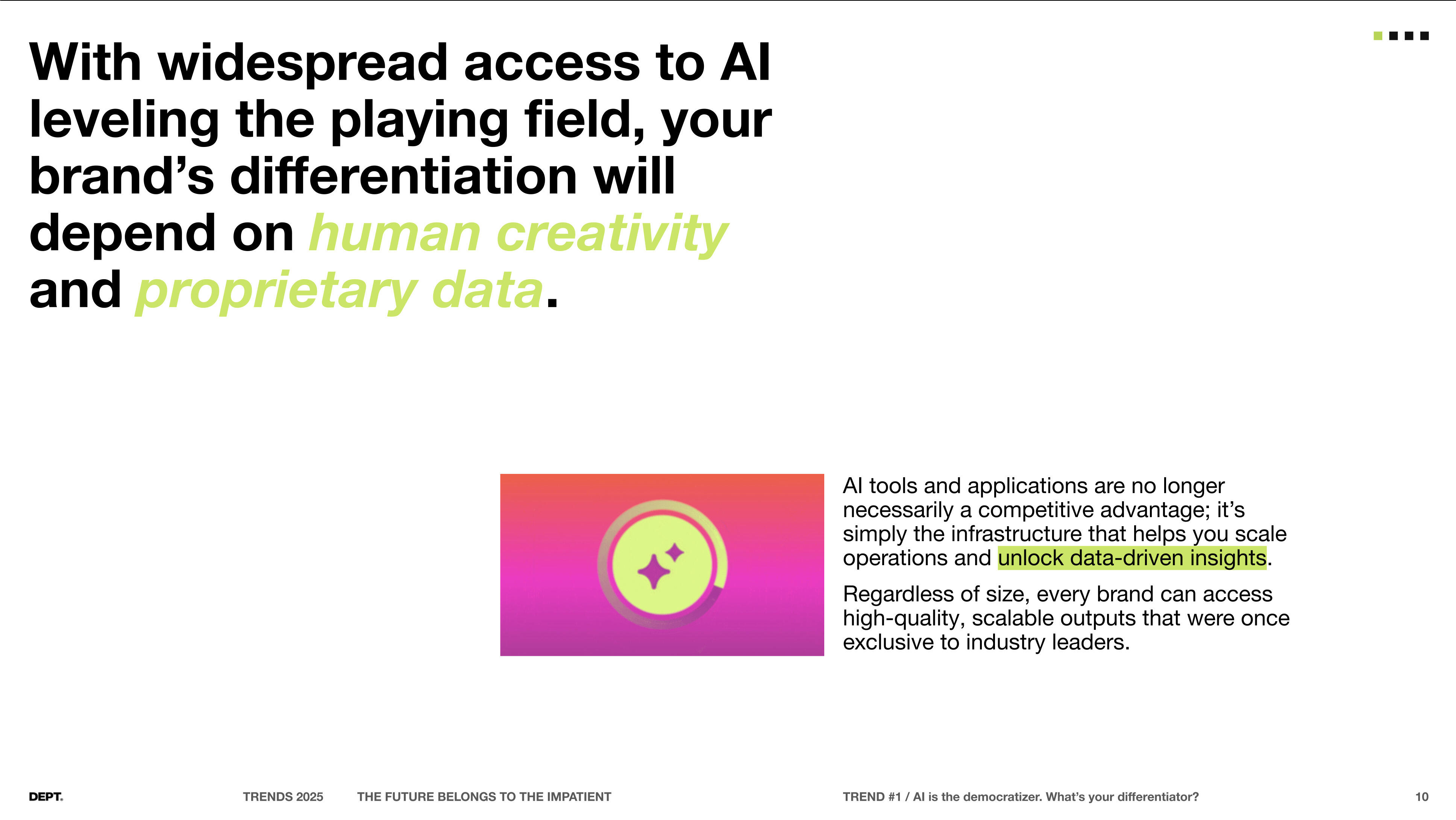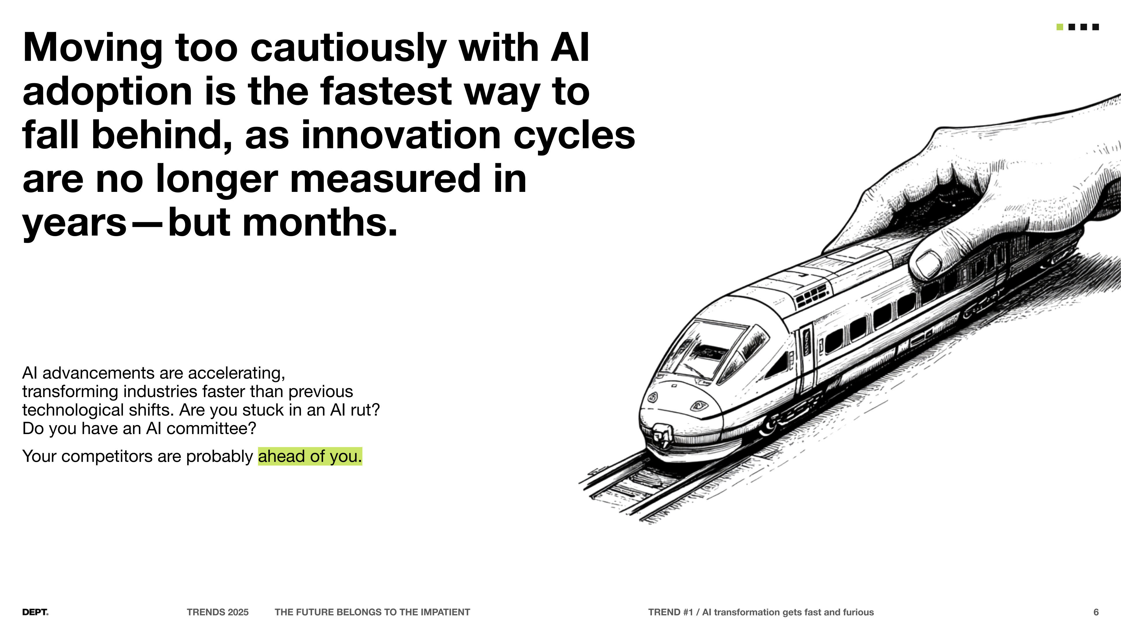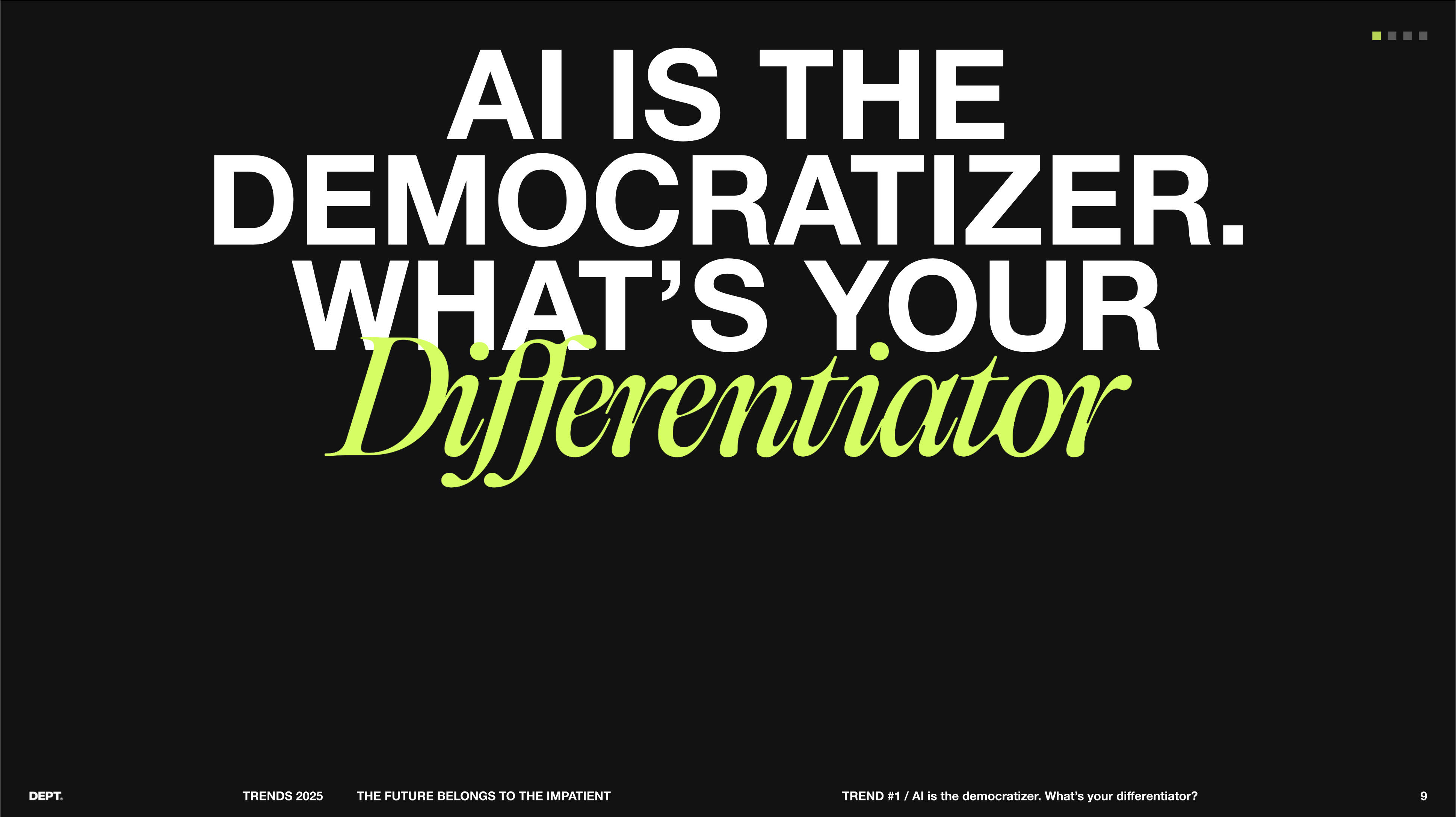 This deck, Dept Trends 2025: The Future Belongs to the Impatient, explores how AI is rapidly reshaping industries and redefining competitive advantage. It argues that organizations must move quickly, adopting AI with agility and experimentation rather than cautious, incremental steps, as innovation cycles now move in months instead of years. The report highlights the democratization of AI tools, stressing that true differentiation will come from human creativity, proprietary data, and the ability to act decisively. It frames impatience not as a weakness but as a strategic necessity for businesses to thrive in an era where transformation is accelerating at unprecedented speed.